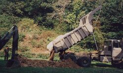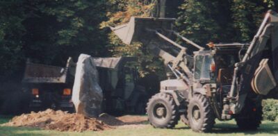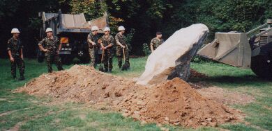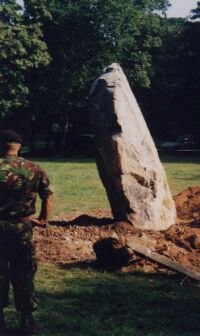 The St. Lawrence Millennium standing stone was put into position on Sunday morning at the Vicart picnic area in waterworks valley. The second standing stone to be raised, it was put into position by a team from the Jersey Field Squadron. Those present included St. Lawrence Constable Iris Le Feuvre and Société Jersiaise president Philip Le Brocq. The next stone is due to be raised next Saturday in St. Brelade.